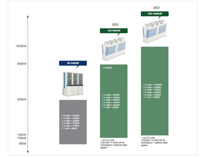 Μοντέρνες αναστρέψιμες αντλίες θερμότητας πηγής αέρα με συμπιεστή μεταβλητών στροφών της Mitsubishi Electric και ψυκτικό μέσο R32 με χαμηλό GWP, 150 έως 180 kW.