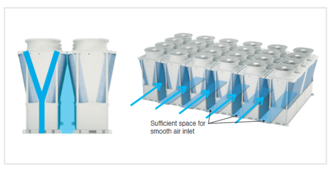 Ακόμη και αν τοποθετηθούν πολλές μονάδες η μία δίπλα στην άλλη, η κυκλοφορία του αέρα στους εναλλάκτες θερμότητας με πτερύγια παραμένει εγγυημένη τόσο στη μικρή όσο και στη μεγάλη πλευρά. Αυτό το μοναδικό σχήμα της μονάδας συμβάλλει στη βελτίωση της απόδοσης, ενώ παράλληλα ελαχιστοποιεί το χώρο εγκατάστασης.