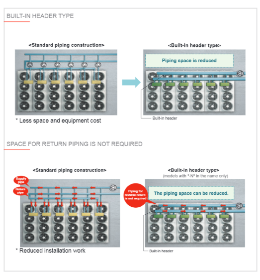 Με τα προαιρετικά εξαρτήματα που διατίθενται στον κατάλογο, μπορούν να συνδεθούν εύκολα έως και έξι μονάδες. Με αυτόν τον τρόπο, δεν υπάρχει ανάγκη προμήθειας σωληνώσεων για τη σύνδεση των μονάδων επί τόπου, μειώνοντας τις εργασίες εγκατάστασης και το αποτύπωμα του συστήματος.
