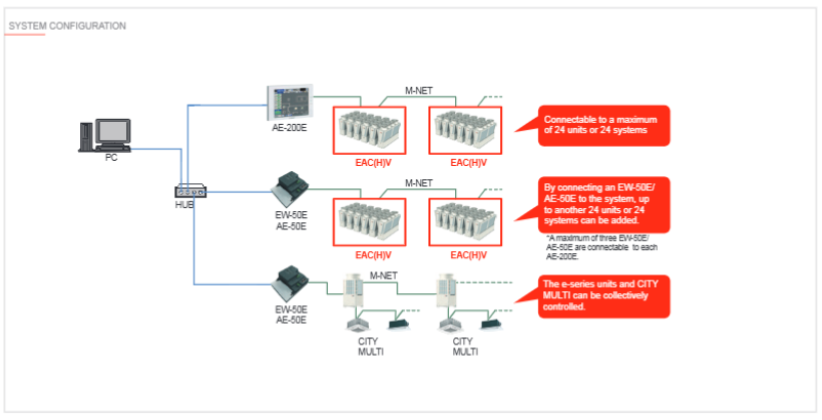 - Μέσω ενός επιβλέποντος AE-200E/A, είναι δυνατός ο ταυτόχρονος έλεγχος των μονάδων VRF και των αρθρωτών μονάδων, με αποτέλεσμα ένα πλήρως επώνυμο ψυκτικό σύστημα της Mitsubishi Electric.