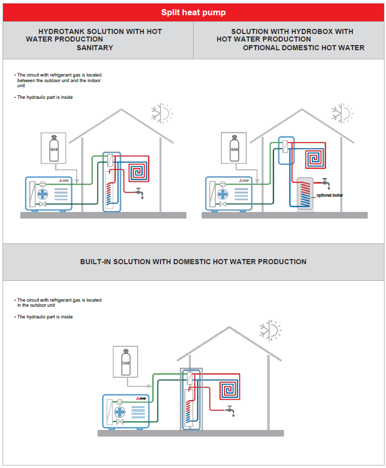 Από την εσωτερική μονάδα, η θερμότητα μεταφέρεται στη συνέχεια στο νερό που κυκλοφορεί μέσα στο σύστημα του σπιτιού. Διατίθενται λύσεις για θέρμανση/ψύξη με ή χωρίς παραγωγή ζεστού νερού χρήσης.