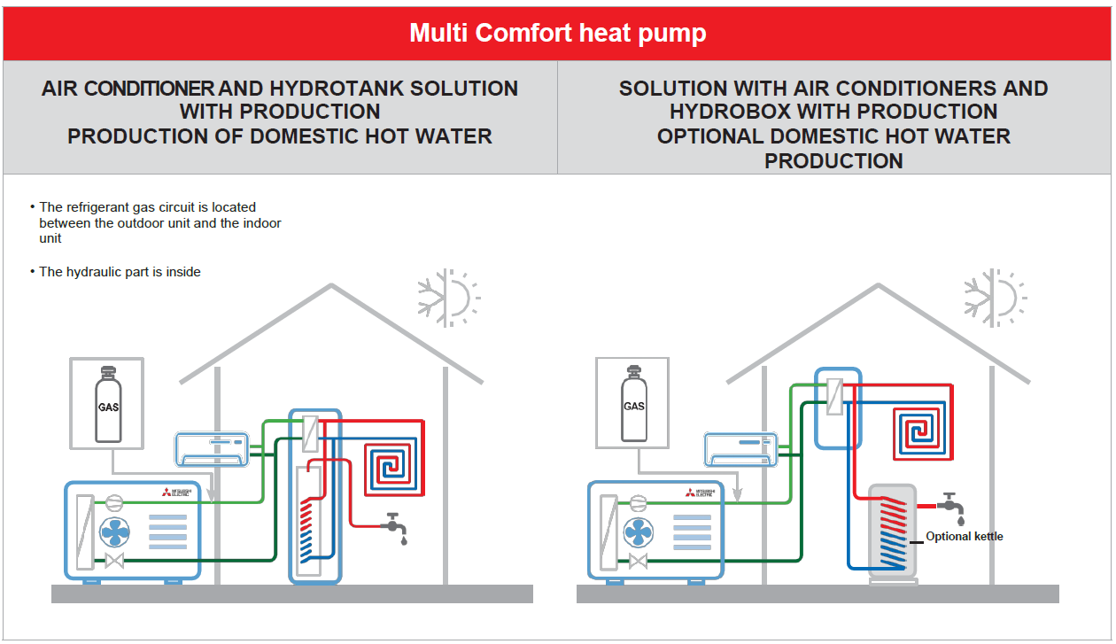 Το σύστημα Multi είναι ένα υβριδικό σύστημα αέρα/αέρα και αέρα/νερού που σας επιτρέπει να συνδυάσετε την ευελιξία ενός κλιματιστικού multi-split για θέρμανση και ψύξη με την άνεση μιας αντλίας θερμότητας υδρονικής λειτουργίας που μπορεί να παράγει ζεστό νερό για θέρμανση και, εάν απαιτείται, και ζεστό νερό χρήσης.