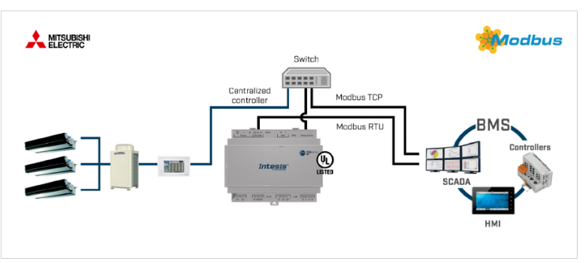 Η διασύνδεση συνδέεται με το εποπτικό σύστημα Modbus μέσω σύνδεσης RS232/RS485 ή TCP/IP over Ethernet και μέσω Ethernet με το σύστημα VRF City Multi της Mitsubishi Electric.