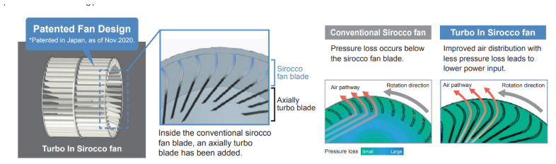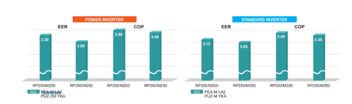 Χάρη στην εισαγωγή του ψυκτικού μέσου R32 σε συνδυασμό με το νέο, βελτιωμένο σχεδιασμό του ανεμιστήρα, κατέστη δυνατή η μείωση της κατανάλωσης ενέργειας με παράλληλη αύξηση της απόδοσης.