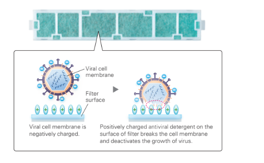 Το φίλτρο V Blocking της Mitsubishi Electric είναι ένα νέο φίλτρο καθαρισμού με ιόντα αργύρου, ενισχυμένο με αντιιική δράση, αποτελεσματικό κατά των βακτηρίων, των μούχλας και των αλλεργιογόνων.