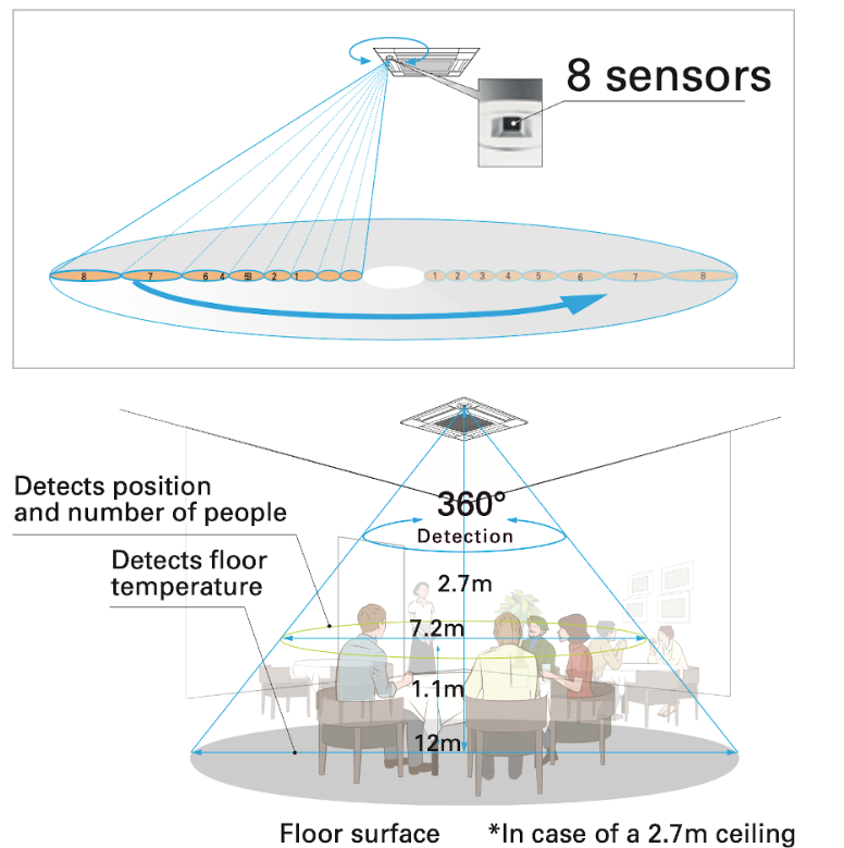 Ο αισθητήρας “3D i-see” ανιχνεύει τον αριθμό των ατόμων που βρίσκονται στον κλιματιζόμενο χώρο. Στη συνέχεια, υπολογίζει το ποσοστό πληρότητας με βάση τον μέγιστο αριθμό ατόμων στον χώρο έως εκείνη τη χρονική στιγμή, ώστε να εξοικονομήσει ενέργεια.