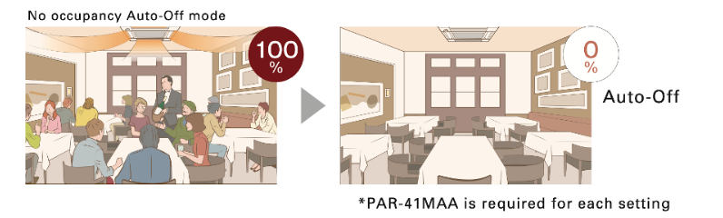 Όταν ο χώρος παραμένει άδειος για προκαθορισμένο χρόνο, το κλιματιστικό απενεργοποιείται αυτόματα για μεγαλύτερη εξοικονόμηση ενέργειας. Ο χρόνος μέχρι τη διακοπή της λειτουργίας μπορεί να οριστεί σε χρονικά διαστήματα των 10 λεπτών μεταξύ 60-180 λεπτών.