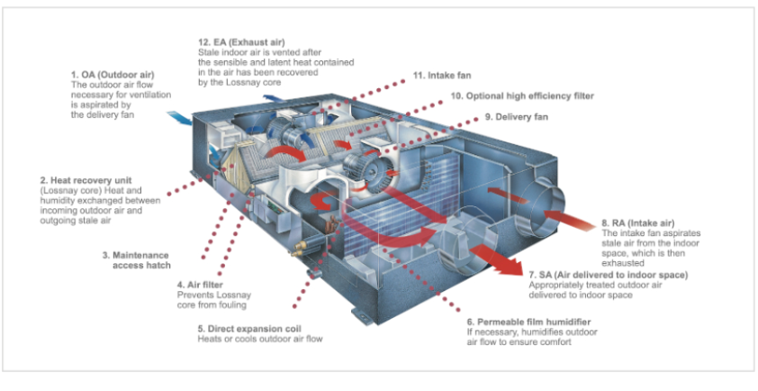 Εσωτερική συσκευασμένη μονάδα εξοπλισμένη με ανεμιστήρα εισαγωγής φρέσκου αέρα, ανεμιστήρα εξαγωγής αέρα, σύστημα φίλτρων, μονάδα ανάκτησης θερμότητας ενθαλπίας Lossnay, αποσβεστήρα παράκαμψης, πηνίο άμεσης διαστολής.