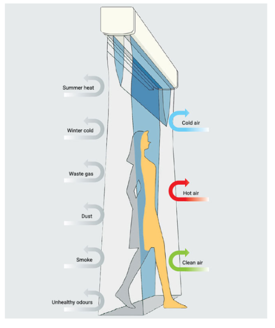Η αεροκουρτίνα όχι μόνο παρέχει αποτελεσματική θερμομόνωση (δηλαδή εμποδίζει τη διαφυγή ψυχρού αέρα κατά την ψύξη και θερμού αέρα κατά τη θέρμανση), αλλά προστατεύει επίσης τους χώρους σας από δυσάρεστα στοιχεία από το εξωτερικό.
