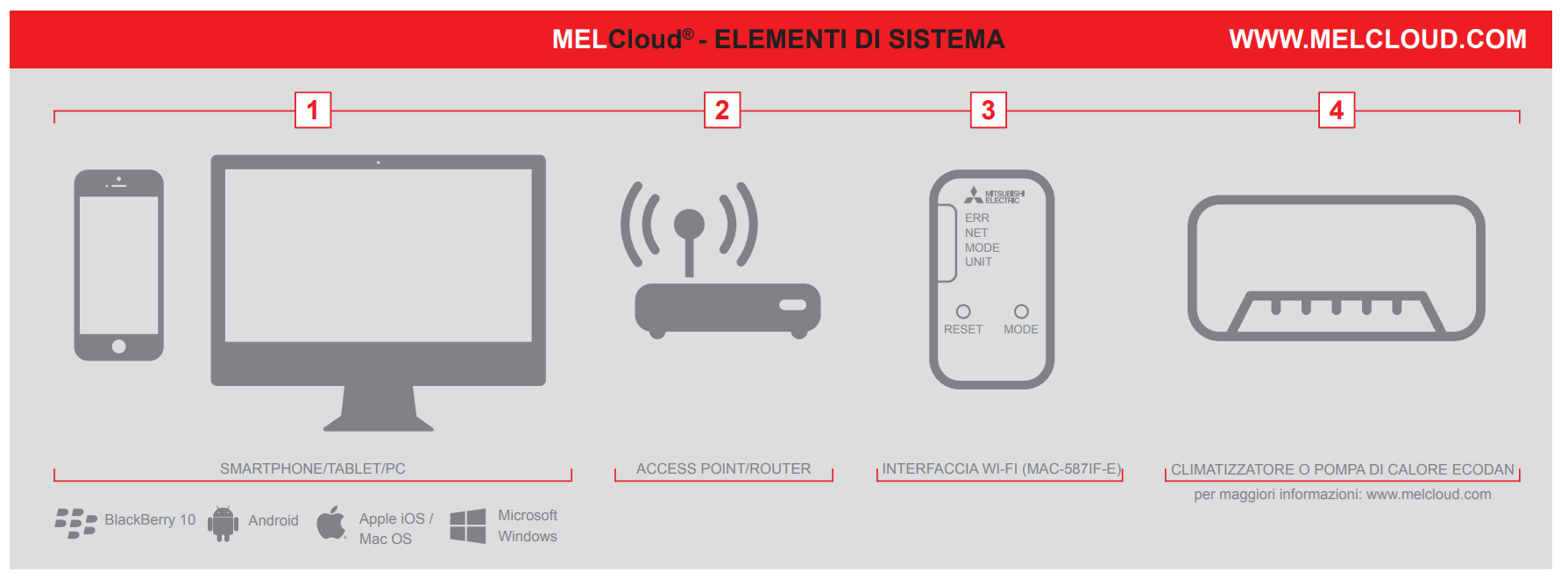 Το MELCloud είναι μια εφαρμογή που επιτρέπει τη διαχείριση του συστήματος μέσω smartphone, tablet και υπολογιστή, τόσο εντός του τοπικού δικτύου wi-fi όσο και εξ αποστάσεως.