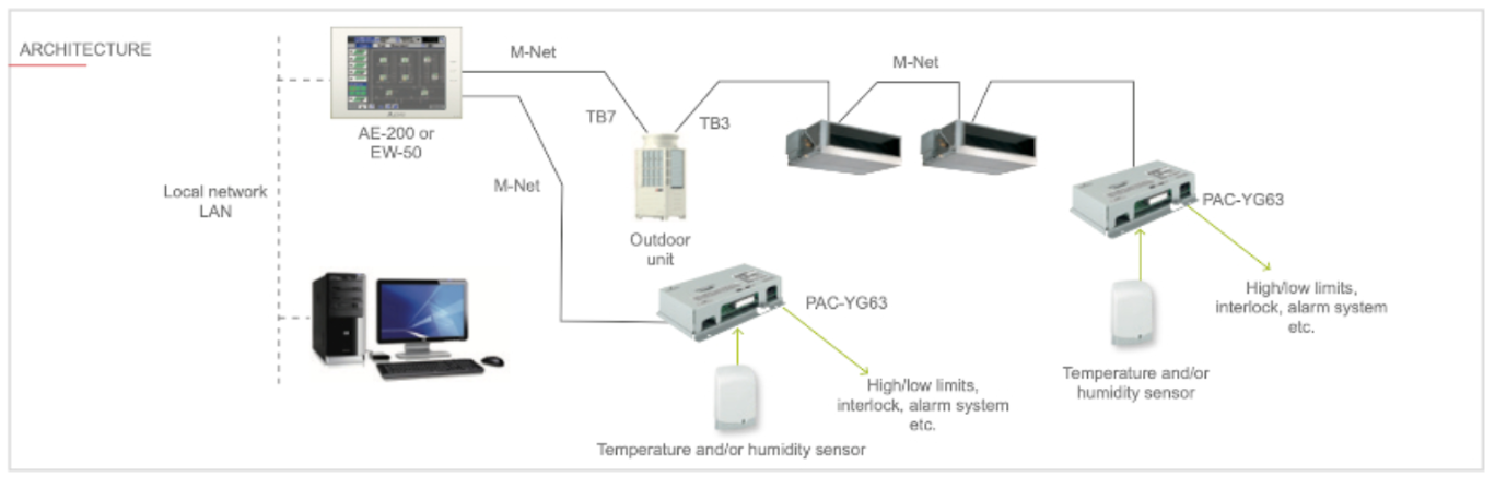Το μοντέλο διασύνδεσης M-Net PAC-YG63MCA είναι μια συσκευή για την απόκτηση αναλογικών αισθητήρων θερμοκρασίας ή υγρασίας, η οποία εγκαθίσταται στον τοίχο ή σε έναν πίνακα ελέγχου.