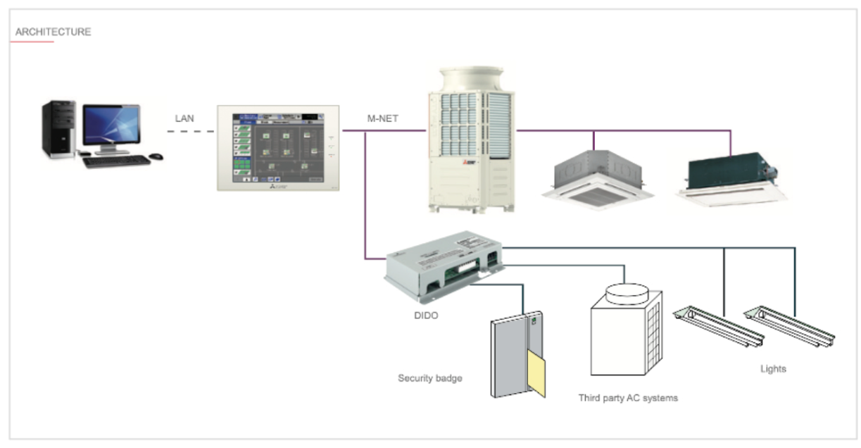 Η διεπαφή συνδέεται απευθείας στο δίκτυο M-Net (TB3-TB7) και καταλαμβάνει μία διεύθυνση παρόμοια με αυτή των εσωτερικών μονάδων (01-50) για κάθε συνδεδεμένο εξοπλισμό (έως 6 μονάδες εξοπλισμού).
