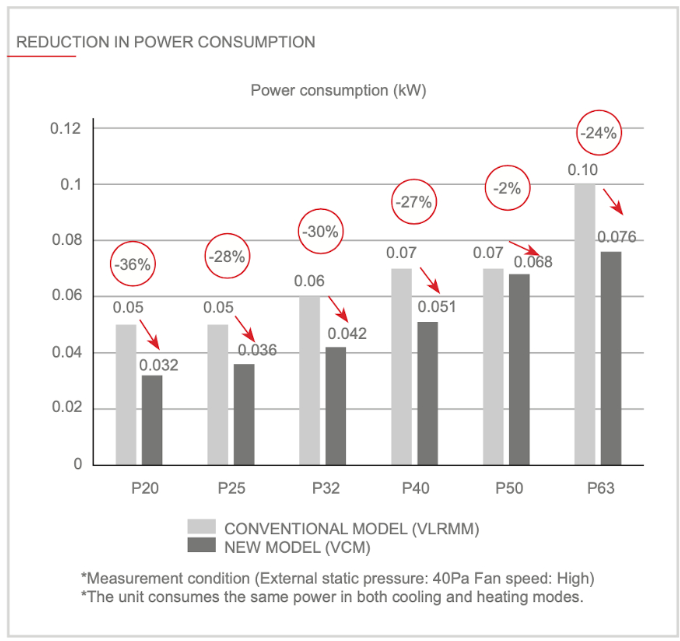 Πλήρως επανασχεδιασμένες ως προς το πλαίσιο και τα εξαρτήματα, οι νέες εσωτερικές μονάδες PFFY-P VCM-E εγγυώνται σημαντική μείωση της κατανάλωσης ενέργειας και της ηχητικής πίεσης τόσο σε λειτουργία ψύξης όσο και θέρμανσης.