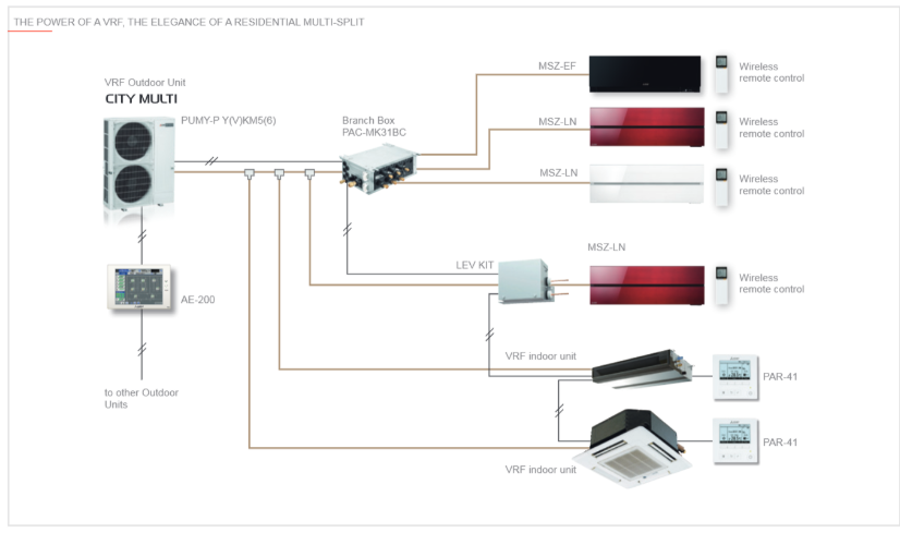 Τα κουτιά διακλάδωσης έχουν σχεδιαστεί για να παρέχουν στο σύστημα τη μεγαλύτερη δυνατή ευελιξία διαμόρφωσης. Αυτό σημαίνει ότι τα συστήματα μπορούν να κατασκευαστούν εξ ολοκλήρου με μονάδες CITY MULTI VRF, συστήματα που αποτελούνται αποκλειστικά από εσωτερικές μονάδες της σειράς Residential/Commercial ή μικτά συστήματα στα οποία συνυπάρχουν οι δύο τύποι μονάδων.