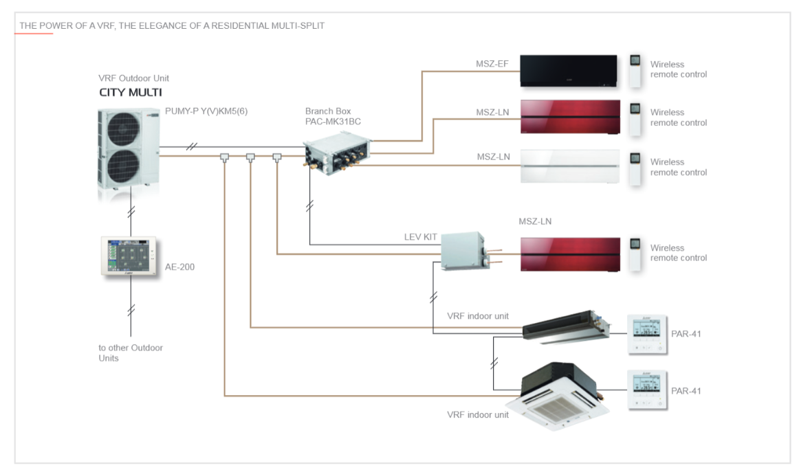 Τα κουτιά διακλάδωσης έχουν σχεδιαστεί για να παρέχουν στο σύστημα τη μεγαλύτερη δυνατή ευελιξία διαμόρφωσης. Αυτό σημαίνει ότι τα συστήματα μπορούν να κατασκευαστούν εξ ολοκλήρου με μονάδες CITY MULTI VRF, συστήματα που αποτελούνται αποκλειστικά από εσωτερικές μονάδες της σειράς Residential/Commercial ή μικτά συστήματα στα οποία συνυπάρχουν οι δύο τύποι μονάδων.