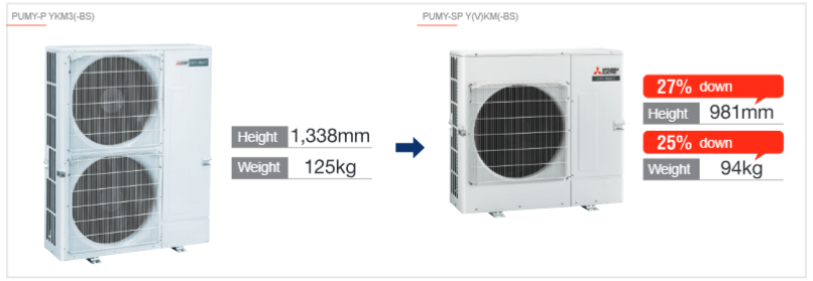 Το συμπαγές πλαίσιο του SMALL Y COMPACT (PUMY-SP) και κυρίως το χαμηλό του ύψος (λιγότερο από ένα μέτρο) το καθιστούν κατάλληλο για εγκατάσταση σε μπαλκόνια. Το χαμηλό βάρος καθιστά τη μονάδα εύκολη στη μεταφορά.