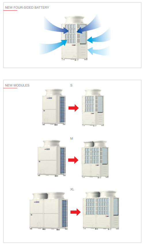 Οι νέες εξωτερικές μονάδες της σειράς YNW χρησιμοποιούν τετράπλευρο εναλλάκτη θερμότητας που βρίσκεται στο πάνω μέρος του πλαισίου κοντά στον ανεμιστήρα. Αυτή η τεχνολογική και κατασκευαστική επιλογή συμβάλλει στην αύξηση της απόδοσης του εναλλάκτη θερμότητας.