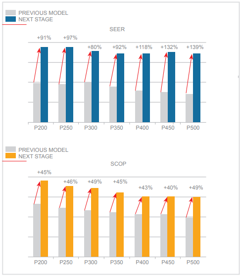 Η ενεργειακή απόδοση έχει βελτιωθεί ακόμη περισσότερο σε σύγκριση με τις μονάδες YLM, σημειώνοντας πλέον κορυφαίες τιμές απόδοσης. Σε σύγκριση με το προηγούμενο μοντέλο, οι τιμές του εποχικού βαθμού ενεργειακής απόδοσης ψύξης (SEER) έχουν αυξηθεί κατά 139% (P500) και οι τιμές του εποχικού συντελεστή απόδοσης θέρμανσης (SCOP) έχουν αυξηθεί κατά 49% (P300 και P500). Έτσι οι νέες μονάδες YNW καταναλώνουν λιγότερη ενέργεια τόσο στη λειτουργία ψύξης όσο και στη λειτουργία θέρμανσης. Εξοικονόμηση καθ' όλη τη διάρκεια του χρόνου!