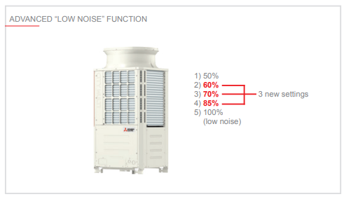 Η λειτουργία «χαμηλού θορύβου» (“low noise”) διαθέτει πλέον πέντε διαφορετικές ρυθμίσεις: 85%, 70%, 60% και 50% (οι τιμές αναφέρονται στην ταχύτητα του ανεμιστήρα). Τα επίπεδα θορύβου ρυθμίζονται απευθείας από τον πίνακα ελέγχου της εξωτερικής μονάδας. Επιλέξτε την κατάλληλη ρύθμιση ανάλογα με τις απαιτήσεις της εγκατάστασης (για εφαρμογές με ειδικούς περιορισμούς στα επίπεδα θορύβου).