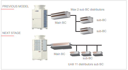 Περισσότερες συνδέσεις (για συστήματα με υποδιανομέα BC SUB) και αυξημένα γεωμετρικά όρια. Στα συστήματα ανάκτησης θερμότητας R2 της νέας σειράς YNW, μπορούν να συνδεθούν έως και 11 υποδιανομείς BC SUB στον κύριο διανομέα BC, για μεγαλύτερη ευελιξία στη διαμόρφωση του συστήματος. Η νέα αρχιτεκτονική επιτρέπει τη μείωση της πλήρωσης ψυκτικού μέσου στο σύστημα.