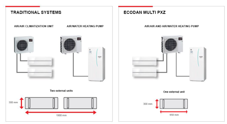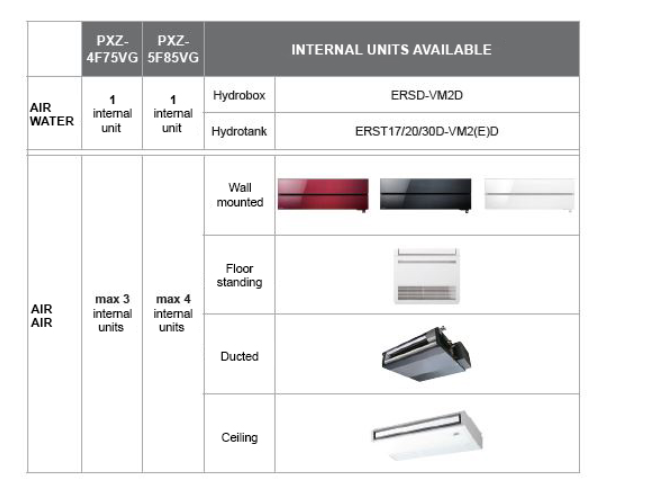 Διατίθενται σε δύο μεγέθη: το μοντέλο PXZ-4F75VG 7,5 kW που σας επιτρέπει να συνδέσετε το πολύ 4 εσωτερικές μονάδες (1 υδραυλική + 3 άμεσης διαστολής) και το μοντέλο PXZ-5F85VG 8,5 kW που σας επιτρέπει να προσθέσετε το πολύ 5 εσωτερικές μονάδες (1 υδραυλική + 4 άμεσης διαστολής).