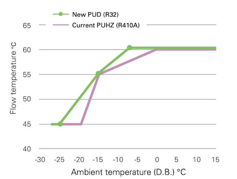 Το PUD-SHWM με ψυκτικό μέσο R32 είναι βελτιστοποιημένο για εξαιρετικά χαμηλές εξωτερικές θερμοκρασίες.