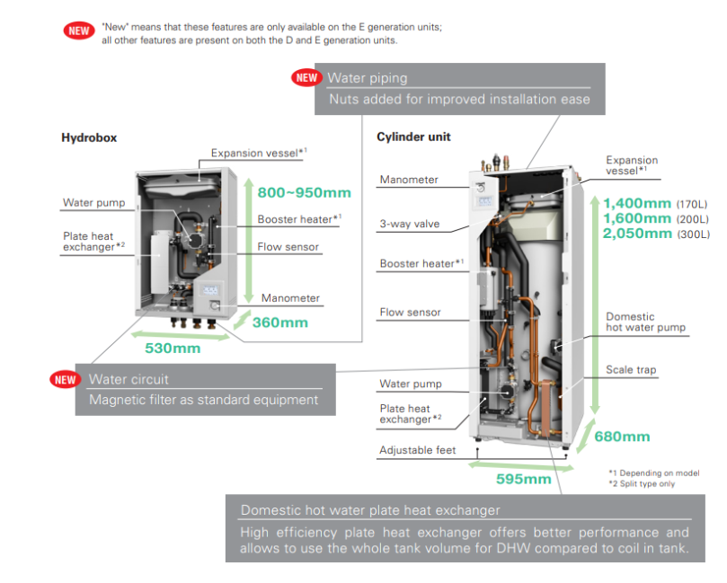 Σε ένα πολύ μικρό χώρο υπάρχει χώρος για τον εναλλάκτη θερμότητας, τον υδραυλικό πυκνωτή, ένα δοχείο διαστολής (εκτός από τα large split με ERSE-MEE), έναν ολοκληρωμένο ηλεκτρικό θερμαντήρα, τα εξαρτήματα ασφαλείας και τη μονάδα ελέγχου για τη διαχείριση της αντλίας θερμότητας με τηλεχειρισμό.