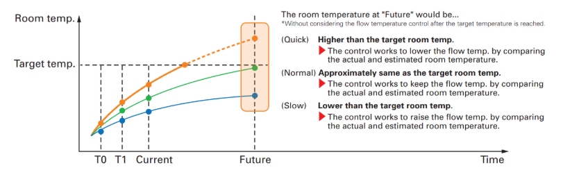 Η αυτοπροσαρμοζόμενη λειτουργία της Mitsubishi Electric ανιχνεύει τη θερμοκρασία του εσωτερικού και του εξωτερικού περιβάλλοντος και υπολογίζει τη ζήτηση θερμότητας που πρέπει να παρέχεται στον χώρο, εξασφαλίζοντας την παροχή της σωστής ποσότητας ενέργειας και αποφεύγοντας τη σπατάλη ενέργειας. Επιπλέον, εκτιμώντας δυναμικά τις μελλοντικές τάσεις της θερμοκρασίας του χώρου, το σύστημα αποφεύγει τις περιττές αυξήσεις της θερμοκρασίας παροχής- η εσωτερική θερμοκρασία μπορεί έτσι να διατηρηθεί σταθερή, αυξάνοντας την άνεση και εξοικονομώντας ενέργεια.