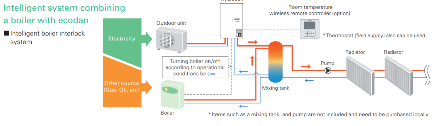 Συνδέοντας το Hydrobox με μια αντλία θερμότητας Ecodan, είναι δυνατή η παροχή ζεστού νερού για θέρμανση, ψυχρού νερού και παραγωγής ζεστού νερού χρήσης με τη χρήση μιας προαιρετικής δεξαμενής.