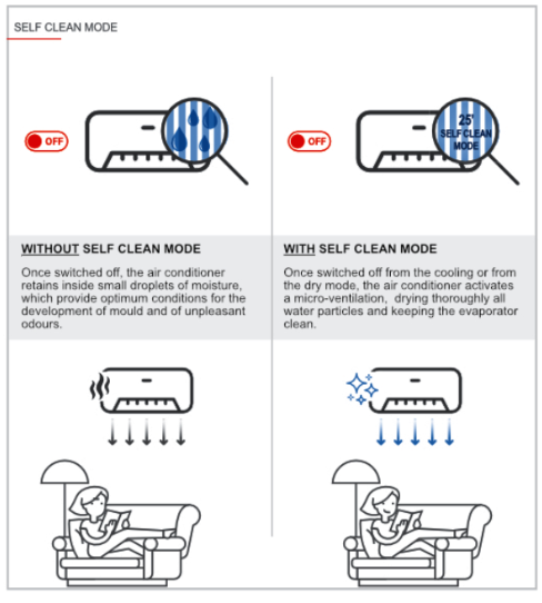 Η νέα λειτουργία Self Clean στο MSZ-AY ενεργοποιεί μικροεξαερισμό στο τέλος της ψύξης ή της αφύγρανσης, στεγνώνοντας τον εναπομείναντα υγρό αέρα και αποτρέποντας τον σχηματισμό μούχλας και οσμών.