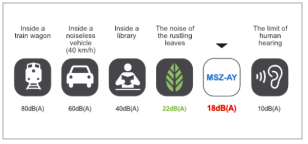 Η περιβαλλοντική άνεση σχετίζεται επίσης με τη στάθμη του ήχου και είναι ιδιαίτερα σημαντική στα υπνοδωμάτια ή στις σπουδές. Η σειρά MSZ-AY παρέχει το ιδανικό κλίμα όλο το χρόνο με επίπεδο ήχου σχεδόν ανεπαίσθητο για το ανθρώπινο αυτί. Τα 18dB(A) που επιτυγχάνονται από το μοντέλο MSZ-AY (μεγέθη 25 και 35) είναι πιο ήσυχα από το θόρυβο που παράγεται από το θρόισμα των φύλλων στον άνεμο, καθιστώντας το κλιματιστικό πρακτικά αθόρυβο για τους ενοίκους του δωματίου. Γι' αυτό το λόγο το MSZ-AY είναι ιδιαίτερα κατάλληλο για οικιακούς χώρους, όπως τα υπνοδωμάτια και τα σαλόνια, όπου περνάμε τον περισσότερο χρόνο μας και πραγματοποιούμε τις καθημερινές μας δραστηριότητες.