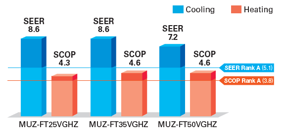 Με εσωτερικές μονάδες που συνδυάζουν λειτουργικότητα, σχεδιασμό και χωρητικότητα και εξωτερικές μονάδες εξοπλισμένες με συμπιεστή υψηλής ταχύτητας, το MUZ-FT VGHZ επιτυγχάνει ταυτόχρονα υψηλή θερμαντική ικανότητα και απόδοση εξοικονόμησης ενέργειας.