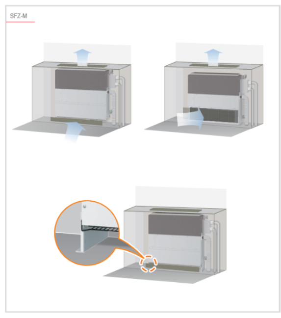 Η κατεύθυνση εισόδου του αέρα, είτε από κάτω είτε από τον μπροστινό τοίχο, μπορεί να επιλεγεί μέσω αντικατάστασης του πάνελ, της γρίλιας και του φίλτρου.